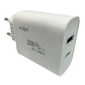 Carregador Turbo Power 20W KLGO PD-300 com duas saídas USB-A e USB-C, chip inteligente que adapta a potência de carregamento, design compacto e portátil, plug padrão europeu (EU).