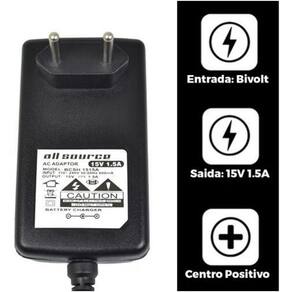 Quais as especificações do produto - input: bivolt 110 - 240v 50-60hz 0.33a - output: 15v - 1.5a positiva - plug: 6,0mm x 3.4mm ou 5.5mm x 2.5mm - comprimento do rabicho: 1,80 metros - cabo de força: acompanha - medidas da fonte: comprimento = 8,7 cm / largura = 4,8 cm / altura = 2,7 cm - cor: preto - atente-se também ao pino conector, ele deve ser igual ao utilizado no seu aparelho comprimento e largura .