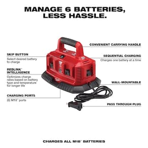 Inclui um plugue de passagem, permitindo o uso eficiente da tomada. Com tempos de carregamento rápidos, ele carrega baterias M18 compactas em 30 minutos e baterias de capacidade estendida (XC) em 60 minutos. Este carregador de seis unidades aumenta a produtividade no trabalho, reduzindo o tempo gasto na troca de baterias.