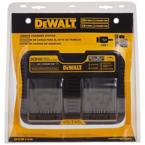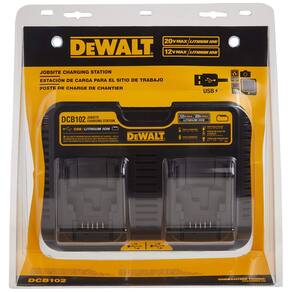 Carregador de bateria DEWALT 12/20V MAX, com fio, estação de carregamento dupla, 2 portas USB incluídas (DCB102) - A estação de carregamento DEWALT carrega simultaneamente (2) baterias de íon de lítio DEWALT de 12 V a 20 V MAX* - Inclui (2) portas USB para carregar dispositivos compatíveis (saída máxima de 1,5 A) - Carrega as baterias em 90 minutos ou menos, minimizando o tempo de inatividade - O diagnóstico com indicador LED comunica o status da carga da bateria: carregada, carregando, substituindo a embalagem e a bateria está muito quente ou muito fria - Carrega (2) baterias de íon de lítio DEWALT de 12 V a 20 V MAX - Inclui duas portas USB para carregar dispositivos compatíveis, como telefones celulares, ipods, tablets - Carrega as baterias em 95 minutos ou menos, minimizando assim o tempo de inatividade - O diagnóstico com indicador LED exibe o status da carga da bateria