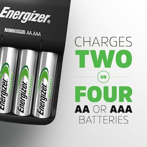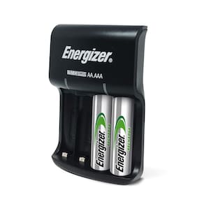- Um carregador de bateria básico Energizer Recharge para pilhas AA e AAA com duas (2) pilhas AA recarregáveis Energizer e um cabo USB para carregar