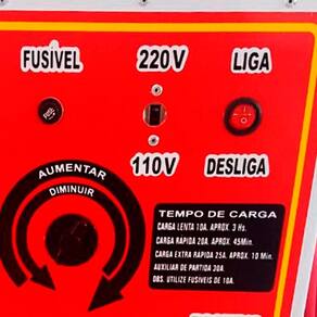 - Funcionamento: Este aparelho permite que seja recarregada 1 bateria de 12V ou 2 baterias de 6V com ligação em série em carga lenta ou rápida. Pode auxiliar partidas em baterias de até 85 amperes. - Aplicações: Carro, trator, moto, barco e caminhão leve