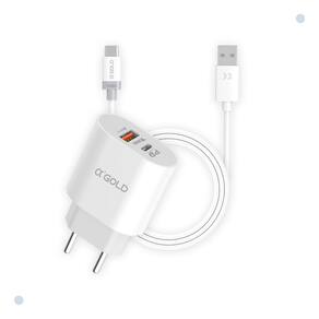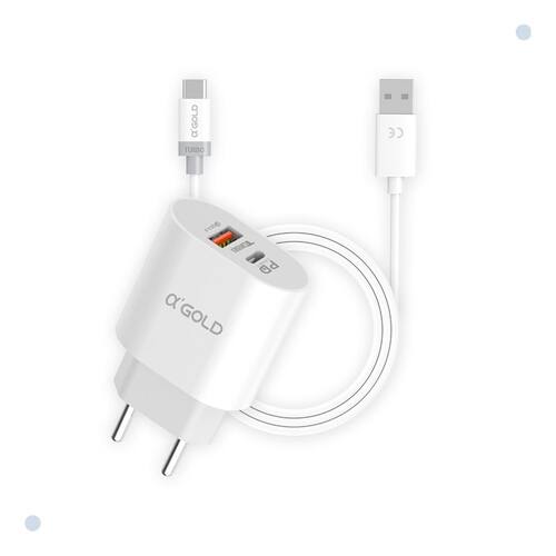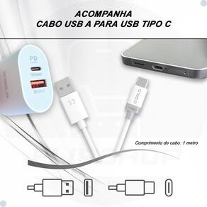 O KIT acompanha: 1 – Carregador de parede com 2 Saídas (PD Tipo C 3.0 / QC 4.0) 1 – Cabo de 1 metro com pontas USB Tipo A para USB Tipo C