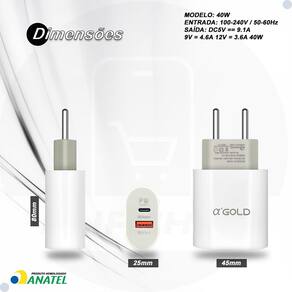 ESPECIFICAÇÕES TÉCNICAS: - Capaz de carregar Ni-CD, Ni-MH baterias de Li-on - Comprimento do cabo 1 metro - Capacidade de carregamento 9100mAh por hora - Entrada: 110V – 220V - Saída: DC5V-9.1A, 9V-4.6A, 12V-3.6A - Potência: 40W - Saídas: PD Tipo C 3.0 / QC 4.0 - Cabo Incluso: USB-A para Tipo-C