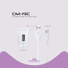 Carregador de Parede com Cabo Tipo-C/1 saída USB - Maketech O carregador de tomada CM-19 é bivolt automático com 1 saída USB. O CM-19 fornece carregamento seguro, com proteção contra surtos de tensão e sobrecarga. Com tecnologia Auto-ID ele tem carregamento inteligente permitindo um carregamento rápido sem viciar a bateria do produto conectado. Acompanha um cabo Micro USB, compatível com Smartphones, Tablets, GPS, baterias portáteis e acessórios Bluetooth (alto-falantes, fones de ouvidos e outros) que tenham entrada de carga Tipo-C.