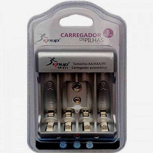 KP-511- Mais uma inovação da Knup. O novo modelo KP-511 é um carregador de pilhas super rápido BL-Volt com função de auto-stop. - Tem a capacidade de carregar simultaneamente quatro pilhas recarregáveis AA ou AAA. Especificações: Entrada AC 100-240V 50/60Hz Saída: DC 2.4V AA/ AAA 400mA DC 9V: 30mA Embalagem: Blister. Dimensões: Ax16cm Lx9cm Cuidados: - Não carregue a bateria de carbono ou alcalina de 1.5V, pois pode causar vazamento ou explosão. - Não misture baterias de especificações ou capacidades diferentes. - Somente para uso interno.