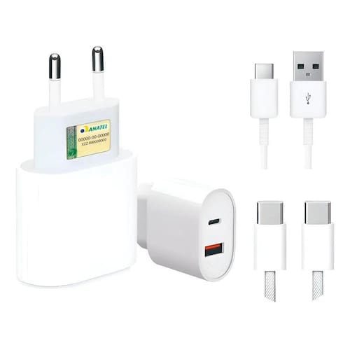 Carregador duplo 20W com duas portas (USBA e USBC), bivolt automático, proteções contra sobrecorrente, sobrecarga e aquecimento, acabamento branco, compacto e robusto.Tipo