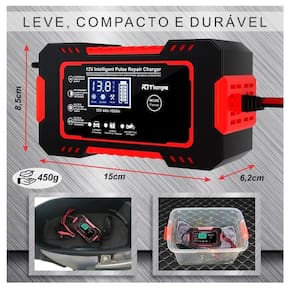 Características especiais: Display informativo, Desligamento automático ao finalizar o carregamento, Função pulsar para reparar a bateria, Carregamento inteligente.