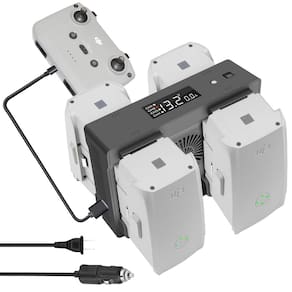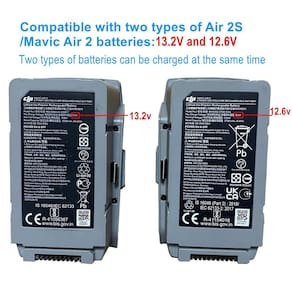 Compatível com bateria drone DJI Air 2S e Mavic Air 2 - Especialmente projetado para baterias DJI Air 2S e Mavic Air 2 de 13,2 V e 12,6 V. Dois tipos de baterias podem ser carregadas ao mesmo tempo, o carregador corresponde automaticamente à tensão - Multifuncional: o carregador de bateria múltipla 5 em 1 vem com adaptador de energia doméstico (parede) e adaptador de carregador de carro, você pode carregar suas baterias em casa ou no seu carro - Carregamento rápido: suporta 1-4 pilhas e 1 controle remoto de carregamento paralelo. leva cerca de 100 minutos carregando 1-4 baterias pelo adaptador de energia doméstico. - [Armazenamento de segurança da bateria] Quando a bateria estiver pronta para armazenar por um longo tempo, é necessário manter a energia em cerca de 50%-80%. Potência total e armazenamento de baixa energia causarão danos à bateria. No modo de armazenamento, o carregador descarrega baterias acima de 50-80%, reduz a carga para 50-80%, enquanto carrega baterias abaixo de 50-80% a 50-80% - Entrada: CA 110-240V ou CC 11-14V, 12A (máx.), Saída: 13,2V/12,6V 8A (máx.) (máximo de 2A em cada ramo), potência total de saída: 104W, saída USB: 5V 2A; chips de proteção de carregamento de segurança inteligentes integrados - Com tela digital, mostra o status de carregamento da bateria, corrente de carregamento e tensão da bateria - ?Conteúdo da embalagem: 1 carregador de bateria múltipla 5 em 1, 1 adaptador de alimentação CA, 1 cabo CA, 1 cabo DC, 1 cabo de carregamento do controle remoto (USB-C) (Observação: pilhas não incluídas)