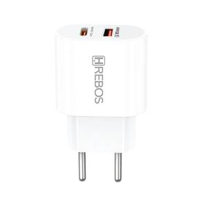 Carregador de parede com 20W de potência real. Possui duas portas de saída: 1x USB-C e 1x USB-A. Compatível com tecnologias de carregamento rápido Power Delivery (PD) e Quick Charge. Chipset de gerenciamento inteligente que identifica o protocolo de carga do aparelho. Estrutura em polímeros de alta resistência térmica e retardantes de chama. Design ultracompacto. Múltiplos sistemas de proteção contra sobrecarga, picos de tensão, superaquecimento e curto-circuito.Tipo