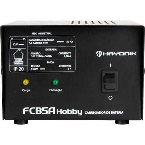 Carregador Inteligente De Baterias Fcb5a Hobby Hayonik A linha de carregadores FCB HAYONIK possuem um sistema inteligente e contam com gerenciamento de tensão e corrente que controla todos os estágios da carga. O carregador de baterias FCBP50E é excelente para efetuar cargas em baterias em situações de emergência, além de portátil, fácil de usar e de fácil transporte. São fabricados e desenvolvidos com matérias primas de excelente qualidade, possuindo uma carcaça de aço, revestida com pintura eletrostática. São indicados para baterias de até no máximo 65A, ou seja, para veiculos automotores como carros de porte menor e populares. Podem ser alimentados nas tensões 127Vac ou 220Vac, lembrando que deve ser ajustado por chave seletora com corrente máxima de carga 5A. Ao final do processo de carga, ou seja, após atingir a carga máxima da bateria, o gerenciador de tensão e corrente entra no estágio de flutuação, onde ele vai fornecendo apenas cargas mínimas para a manutenção, o que mantém a bateria carregada sem ocasionar o desgaste, garantindo a máxima eficiência do produto. Além disso possui LEDs indicadores de carga, transistores MOSFETs para controle de carga e um Relé de proteção quando as garras polarizadas invertidas ou curto-circuito entre elas.Fusível de Saída:3A Conector:Garra jacaré isolada Peso:2,95 Kg Pesquisa:carreg|flutuação|flutuador|carga|jacare|