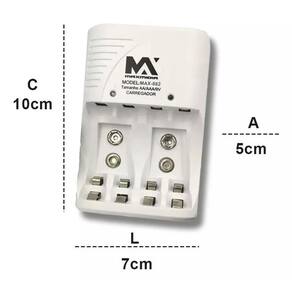 Carregador Para 4 Pilhas Aa/aaa/9v C/inmetro Max-882 Maxmidi Carregador Para 4 Pilhas Aa/Aaa/9v C/Inmetro Max-882 Maxmidia Sem Pilhas Carregador de Pilhas AA / AAA / Bateria 9v Rápido Bivolt - Maxmidia Com entrada dobrável para melhor armazenamento caso precise guarda-lo Ideal para carregar pilhas que são usadas em brinquedos, controle remoto, lanternas, Relógios de parede, calculadoras, câmeras fotográficas, etc.. O que você precisa saber sobre este produto Voltagem de entrada: 110V/220V Suporta carregamento de baterias de tamanhos AA, AAA e 9V Capacidade de carga de 2600 mAh Características principais Marca Maxmidia Modelo MAX-882 Inclui pilhas Não Quantidade de portos de carga 4 Carrega 4 pilhas AA ou 4 AAA ou 2 baterias 9v, NI-MH, NI-CD entre 6 e 8 horas Capacidade de carga das baterias 2600 mAh Material: Plástico, Metal e Componentes eletrônicos Plug articulado Bivolt: 127V-220V Frequência: 50/60Hz Corrente: 0,5 A Máx Saída: AA 200mA / AAA 100mA / 9V 30mA / 2.4V 400mA Comprimento: 10cm Largura: 7cm Altura: 5cm Peso: 0,095g Obs: Pilhas recarregáveis não inclusas Embalagem 1 Carregador Para 4 Pilhas Aa/Aaa/9v C/Inmetro Max-882 Maxmidia Sem Pilhas 3 Meses Marca: Não Informado