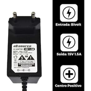 Quais as especificações do produto - input: bivolt 110 - 240v 50-60hz 0.33a - output: 15v - 1.5a positiva - plug: 5,5mm x 2,5mm - comprimento do rabicho: 2,50 metros - cabo de força: acompanha - medidas da fonte: comprimento = 8,7 cm / largura = 4,8 cm / altura = 2,7 cm - cor: preto - atente-se também ao pino conector, ele deve ser igual ao utilizado no seu aparelho comprimento e largura .