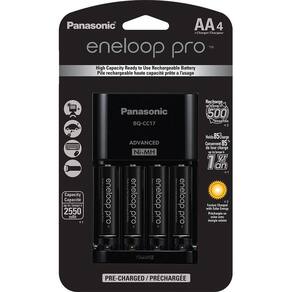 Carregador De Pilhas Eneloop Pro Panasonic Com 4 Pilhas Aa Pilhas recarregáveis Panasonic Eneloop Pro, 4 x AA NiMH 2550 mAh. Pacote com 4 pilhas AA com carregador. Oferece alta potência sem efeito de memória e longa vida útil. Ideal para os equipamentos atuais que necessitam de pilhas AA. Possuem voltagem de 1.2V e capacidade de 2550 mAh. Fazem parte do tipo de pilhas chamadas de Low Self-discharge, podem ser guardadas por um longo período de tempo, até 3 meses, e mantém em torno de 85% de sua carga em um período de 1 ano se não forem utilizadas. Já vem pré carregadas e prontas para usar, podendo ser recarregadas até aproximadamente 500x. O carregador que acompanha o kit possui 4 canais independentes de carga e um LED para cada canal para informar quando a pilha está carregada. Pode ser utilizado para recarregar pilhas AA ou AAA. Especificações: Tipo: NiMH recarregável, Low Self-discharge. Capacidade: 2550 mAh, 1.2V. Tempo de recarga: Aproximadamene 7 horas para recarregar as pilhas quando estiverem completamente sem carga. Plugue do carregador: 2 pinos chatos, padrão EUA. Produto 100% original. Carregador fabricado na China, pilhas fabricadas no Japão. Produto importado dos EUA. Conteúdo do pacote: 4 pilhas recarregáveis Panasonic Eneloop Pro AA NiMH 2550 mAh. 1 carregador de pilhas Panasonic BQ-CC17 Advanced Charger. Peso total do pacote: 0,45 kg. Dimensões do pacote: 27 x 18 x 9 cm.