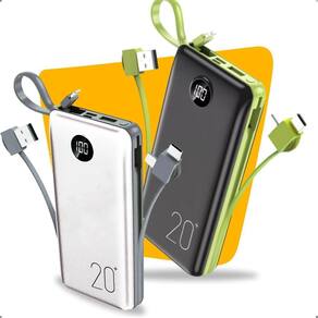 Capacidade de 20.000mAh, ideal para múltiplas recargas. Possui saídas duplas para carregar dois dispositivos simultaneamente. Suporta de 4 a 6 cargas completas em smartphones. Design compacto e portátil.Tipo