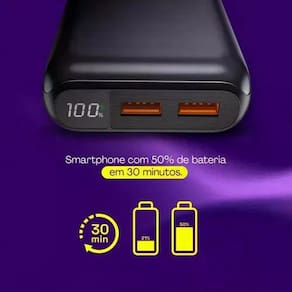 Uma característica impressionante é a sua velocidade de carregamento, capaz de fornecer até 50% de carga em apenas 30 minutos para dispositivos móveis que suportam o carregamento rápido de 20W. A tecnologia Pass Through permite que um dispositivo carregue enquanto o próprio power bank está conectado à tomada.