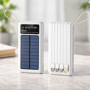 Carregador portátil com 5 em 1, armazena energia solar, iluminação LED, cabo de carregamento embutido, tela de LED, cordão suspenso e cabo de carregamento removível. Possui cabos Tipo-C/Micro/IOS/USB. Capacidade de 20.000mAh (74Wh). Potência máxima de entrada de 12W. Saída de cabo IOS / Tipo-C / Micro: 5V/2.4A. Saída USB Port: 5V/2.4A. Entrada Tipo-C: 5V/2.4A. Entrada Cabo USB: 5v/2.4A. Entrada energia Solar: 5V/0.3A.Tipo
