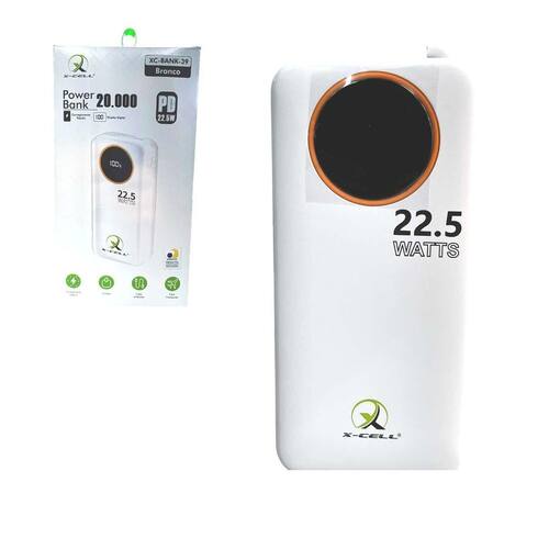Powerbank com 24.000mAh de capacidade, 1x USB-A e 1x Tipo-C de saída, 1x Micro USB e 1x Tipo-C de entrada. Possui cabos embutidos: 1x Lightning e 1x Tipo-C Android. Tensão de saída: 5V/2.1A máx.Tipo