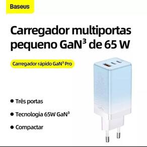 Este carregador de 65w possui saídas USB-C e USB-A, tornando-o um carregador de 65w perfeito para viajar e carregar todos os seus produtosCarregador USB-C de 65w com 3 portas USB e tecnologia GaNCarregador de parede baseus gan 3 pro 65w +1 cabo usb tipo c nas duas pontas com 1 metro 100w baseus- compacto: o tamanho compacto ocupa pouco espaço 40% menor que outros dispositivos com 3 entradas .- tecnologia gan3: a nova tecnologia gan3 oferece maior potência em um menor tamanho. Experiência de carregamento simplificada que substitui carregadores pesados e maiores.- tecnologia de carregamento bps ii: habilita o funcionamento de três saídas para carregamento 2 x tipo c + usb a , e altíssima velocidade de carregamento quando usadas separadamente- tecnologia 65w dual type-c blind interpolation: cada saída tipo c fornecem uma potência de 65w cada quando carregando laptops e notebooks.- alta compatibilidade: fornece compatibilidade com protocolos pd, qc, scp, fcp, afc e outros protocolos.Saídas:Tipo-c 1: 11v / 3a, 5v / 3a, 9v / 3a, 12v / 2a, 15v / 3a, 20v / 3,25a máx.Tipo-c 2: 11v / 2.7a, 5v / 3a, 9v / 3a, 12v / 2.5a, 15v / 2a, 20v / 1.5aUsb: 4.5v / 5a, 5v / 4.5a, 9v / 3a, 12v / 2.5a, 20v / 1.5a máxTipo-c 1 + tipo-c 2: 45w + 20w 65w Tipo c 1 + usb: 45w + 18w 63w Tipo c 2 + usb: 5v / 3a 15wTipo c 1 + tipo c 2 + usb: 45w + 15 w 60w Potência total de saída: 45w + 20w 65w máx.Certificação de qualidade: rohs, ce, fcc, ccc