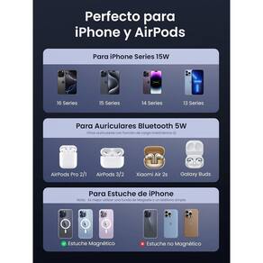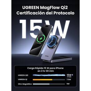 Carregador sem fio magnético Qi2 de 15W, dobrável, com ajuste de ângulo de 0 a 70 graus. Possui 18 ímãs N52 para alinhamento e carregamento imediatos. Inclui proteções contra sobretensão, subtensão, superaquecimento e curto-circuito. Suporta carregamento simultâneo de telefone e AirPods. Pode ser usado como suporte de telefone. Tamanho dobrado: 116 x 66 x 24 mm. Peso: 235g.Tipo