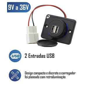 Carregador Tomada Usb Dupla Automotivo Orbe 9V A 36V Entrada 1A 5V Saída Carro Van Ônibus Caminhão Descrição:O carregador usb light possui duas saídas retroiluminadas de usb de 5v, possibilitando o carregamento de diversos dispositivos. Com design compacto e discreto o carregador foi planeado com retroiluminação, ajudando o usuário a encontrar o conector mesmo no escuro. As saídas de carregamento são compatíveis com a maioria dos smartphones e a proteção contra curto-circuto protege os aparelhos de qualquer surto de tensão. Corrente de carregamento é 1,5a e com baixo consumo de apenas 0,3w. Por ser um carregador fino, não é necessário fazer furação para encaixe, apenas necessitando furação para fixação com dois parafusos. Características:- tampa protetora para prevenir o acúmulo de poeira ou sujeira e danos quando em desuso prolongando a vida útil do dispositivo.- carregador usb duplo - luz suave de sinalização- led indicador auxilia o usuário a encontrar o encaixe mesmo quando a claridade estiver baixa. Especificação técnica:Alimentação: 9 32vCorrente de carga máxima: 2x 1,5aTensão de saída: 5vConsumo: 0,3wGrau de proteção: ip65Cor: pretaTemperatura de operação: -20c 60cQuantidade led's : 2 ledCor da iluminação: azulPeso aproximado: 100gDimensões a x l x p: 48 x 64 x 18mm Conteúdo da embalagem:- 01 carregador usb duplo
