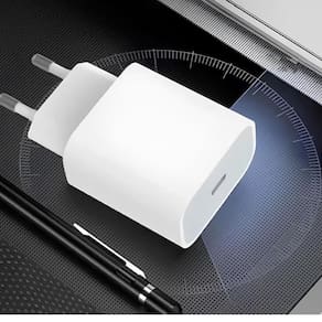 Carregador de celular na cor branca, com função de carregamento turbo. Fonte e cabo compatíveis com tecnologia turbo. Plugue da fonte tipo C Macho e cabo tipo C Macho. Cabo também funciona para transferência de dados.Tipo