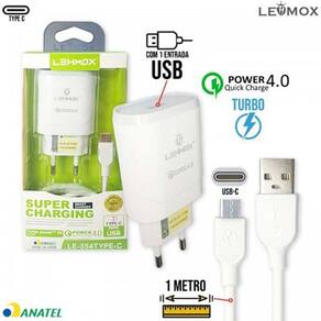 Carregador lehmoxUm super carregador compatível para todas as entradas usb com carregamento rápido turbo, possui material sofisticado e camada protetora contra aquecimento à prova de fogo. É um produto de alta qualidade e com resistência a quedas.O seu aparelho celular precisa ter a tecnologia de carregamento rápido para que o carregador possa funcionar com 100% da sua capacidade e carregar o seu celular no melhor tempo possível.EspecificaçõesCarregador Com Cabo Tipo CModelo: le-354type-cInput: 100-240v 50/60hzOutput: 5v=30w 9v=20w 12v=18wCódigo anatel: 107392013196Carregador turbo usb + caboPeso: 50gr