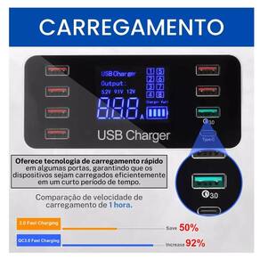 O design compacto do carregador não ocupa muito espaço e ainda conta com um painel LED que exibe informações sobre o status de carregamento, garantindo que você tenha total controle sobre a carga dos seus dispositivos. Seja para uso pessoal ou para atender às necessidades de uma equipe, o Carregador Turbo De Mesa USB 8 Portas é a solução perfeita para facilitar o seu dia a dia.