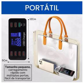 Equipado com 8 portas USB, este carregador permite que você carregue vários dispositivos simultaneamente, otimizando o tempo e mantendo seus eletrônicos sempre prontos para uso.