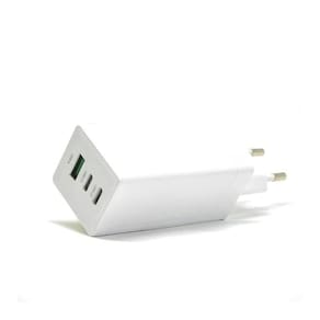 Carregador Ultra Rápido Gan 65W com 3 portas (1 USB-A, 2 USB-C). Tecnologia GaN para menor aquecimento e maior eficiência. Compacto e potente.Tipo