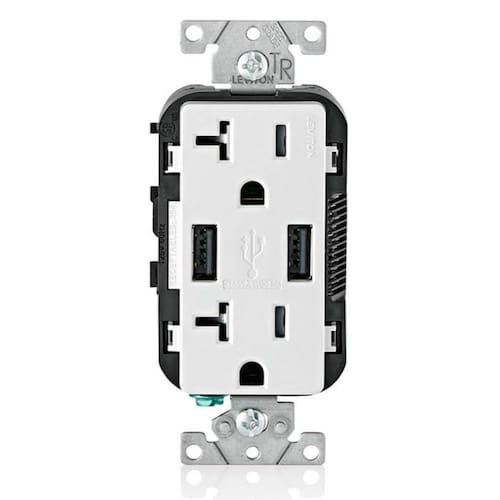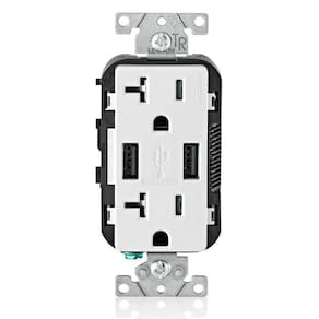 TomadaCarregador de parede USB tipo A Leviton T5832-W com tomada resistente a violações de 20 A, carregador USB para smartphones, branco
