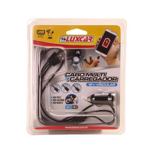 Carregador Veicular 12V Luxcar Fique prevenido com o Cabo Multi + Carregador 12 v Veicular Luxcar, uma solução completa para carregar a bateria do seu portátil. Compatível com a maioria dos aparelhos carregáveis por USB do mercado. Fique tranquilo quando esquecer o carregador na sua casa. Vantagens: Exclusivo cabo mola. Converte 12v e 5v. Leve e compacto. LED de indicação de corrente. Modo de usar: O Carregador 12 v Veicular Luxcar converte a corrente 12 v do seu carro em 5 v. Possui LED de indicação de corrente e tem um design discreto e compacto. Validade Indeterminada. Marca: Não Informado