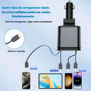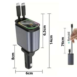Carregador veicular inteligente de 66W com 2 cabos retráteis embutidos (USB-C e Lightning), 2 portas adicionais (USB-C e USB-A), permitindo carregar até 4 dispositivos simultaneamente. Possui projetor de luz ambiente integrado, plugue ajustável em 180°, proteção contra sobrecarga e curto-circuito. Compatível com veículos 12V e 24V.Tipo