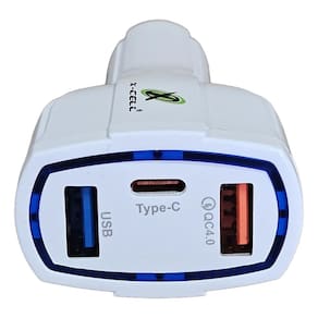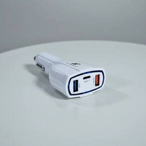 Carregador veicular com 30W de potência máxima, 2 portas USB e 1 porta USB-C PD. Suporta carregamento rápido.Tipo