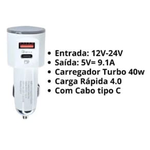Com este carregador veicular você pode ficar seguro e despreocupado caso acabe a bateria do seu celular ou tabletEste carregador contem duas entradas para cabos, tanto Tipo C, quanto USB, seja seu celular ANDROID OU IPHONEVocê dentro do carro mantém sua bateria cheia com este carregador veicular, ótimo para viagens longas, e idas e vindas do seu serviçoótimo para quem trabalha com veículos, mantenha sempre sua bateria de celular cheia.Facilidade podendo carregar até mesmo dois dispositivosPara qualquer dúvida estamos a disposição para responder todas suas perguntas, conte conosco. Marca: Não Informado
