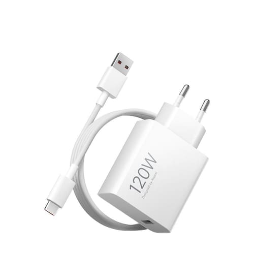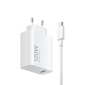 Carregador ultrarrápido Xiaomi HyperCharge 120W com cabo USB-A para USB-C. Múltiplas camadas de proteção contra superaquecimento, sobretensão e curto-circuito. Corpo compacto e leve (170g). Entrada bivolt (100-240V).Tipo