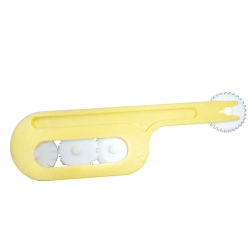 Descrição: Contém: 01 Carretilha Para Confeitar 4 Discos Blue Star Ideal para cortar e modelar pasta americana, fondant e massas em geral. Material: Poliestireno Medidas aproximadas do produto: Comprimento 13cm x largura 4cm Disco: Diâmetro 2,2cm Conteúdo: 1 Carretilha 4 Discos Removíveis. Ean: 7898417465085
