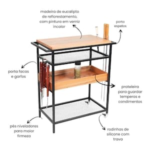 2. Armazenamento Inteligente: Com duas prateleiras em tela expandida e duas prateleiras em madeira de Eucalipto de reflorestamento pintada com Verniz Incolor, você terá amplo espaço para organizar todos os seus utensílios de churrasco, temperos e outros acessórios.