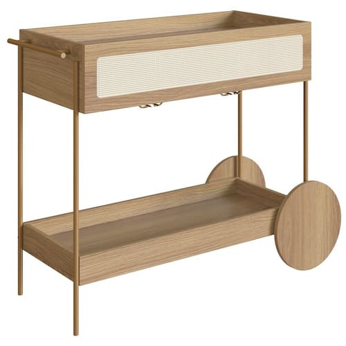 MDPCarrinho Bar Com Porta Taças 110 CM Pés Em Metal Oslo 28964, clássico, minimalista e multifuncional, o móvel ideal para você que não abre mão de um bom drink, seja acompanhado ou em seu momento individual de lazer. Estrutura em MDP com acabamento BP e metal. Possui prateleira de 15 mm, gaveta com corrediças telescópicas e aplique de tela sintética, dando ao produto um traço clássico e artesanal. Possui também 02 porta taças em aço na cor dourada. Seu puxador e pés são de metal com sapatas emborrachadas. Para agregar ainda mais charme e personalidade, ele possui rodas (não giratórias) decorativas. Capacidade de peso suportada: 23 Kg distribuídos, sendo: tampo e bandeija inferior até 10 Kg e gaveta até 3 Kg suportados. Com seus traços suaves e acolhedores, ele irá conferir sofisticação e aconchego à sua casa. Este móvel chegará na sua casa separado em 01 volume.