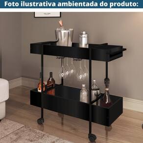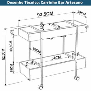 O Carrinho Bar da Artesano é um móvel confeccionado em MDP BP 15mm, fundo MDF 6mm, estrutura metálica em aço carbono de tubo redondo de diâmetro 15mm com acabamento em pintura epóxi fosca. Um móvel multifuncional que facilita na hora de organizar e armazenar diversos objetos. Traz como característica um traço industrial, sofisticado e moderno.