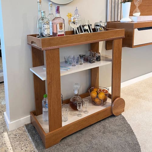 O Carrinho Bar Rosé é uma obra de arte que transcende a função de um simples móvel. Seu design sofisticado se destaca nos detalhes, como a borda metalizada no tampo, proporcionando um toque de luxo e cuidado com o visual. Com amplo espaço interno para organizar bebidas, copos e acessórios de forma elegante, oferece praticidade com rodinhas e um estiloso puxador, permitindo mobilidade suave para suas celebrações. As rodas decorativas em MDF adicionam um charme extra, complementando sua estética única. Versátil, pode ser uma declaração de estilo em qualquer ambiente da casa.