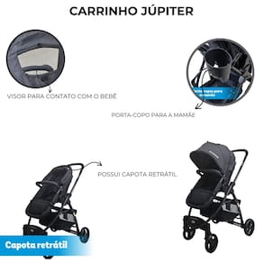 Carrinho de bebê 3 em 1 passear júpiter vira moisés travel system preto até 15 kg Este versátil carrinho 3 em 1 é a escolha ideal para pais modernos, oferecendo conforto e praticidade desde o nascimento até os 15kg da criança. Com um cinto de segurança de 5 pontos e estrutura em aço, o carrinho júpiter garante segurança e durabilidade incomparáveis. Seu assento reversível e ajustável em várias posições permite adaptar-se às necessidades dos pequenos em diferentes fases. O assento do carrinho júpiter pode ser transformado em um moisés para os momentos de descanso do bebê com facilidade. Possui 2 rodas dianteiras giratórias e fixas e 2 rodas traseiras com sistema único de freios, garantindo a estabilidade e mobilidade necessárias para os passeios. Além disso, com sistema de fechamento tipo envelope, tornamos o transporte e armazenamento do carrinho uma tarefa simples e rápida para os pais ocupados. E para oferecer ainda mais conveniência, ele é compatível com o bebê conforto aconchego vendido separadamente da passear, garantindo uma experiência completa desde os primeiros dias do bebê. Inmetro: 001548/2024 Características: Cor: preto Assento com ajuste em várias posições Cinto de segurança de 5 pontos Cesto com capacidade de 2 kg Capota retrátil Capa com extensor Porta copo Assento vira moisés Fechamento tipo envelope Freio com sistema único de acionamento nas rodas traseiras de 12 meses direto com o fabricante Medidas do carrinho aberto: 107 x 57 x 80 cm Marca: Não Informado