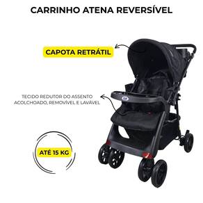 Carrinho de bebê atena reversível até 15 kg capota retrátil porta copos preto Carrinho atena reversível Desenvolvido para crianças de 0 a 15kg, o carrinho de bebê atena reversível feito em tecido oxford apresenta uma estrutura robusta de aço, garantindo segurança e durabilidade para os pequenos. Seu assento ajustável em 3 posições proporcionando conforto personalizado em qualquer situação. Equipado com cinto de segurança de 5 pontos, os pais podem passear tranquilamente. Além disso, o fechamento deste carrinho é fácil e prático usando apenas uma mão, o que torna o transporte e armazenamento uma tarefa simples e rápida. A capota retrátil oferece proteção contra o sol e outros elementos, enquanto o eixo traseiro e as rodas dianteiras removíveis facilitam ainda mais o transporte e armazenamento do carrinho. O visor na cabeceira do assento permite aos pais manter contato visual com o bebê em todos os momentos, proporcionando tranquilidade. E o tecido acolchoado removível e lavável garante praticidade na limpeza e manutenção do carrinho. Para maior comodidade, o carrinho de bebê atena reversível conta com porta copos duplo para o bebê e na alça para a mamãe, garantindo praticidade durante os passeios. E para fechar com chave de ouro, a alça reversível oferece versatilidade para os pais. O carrinho atena reversível conta com um amplo cesto porta objeto com capacidade de até 5kg e é compatível com o bebê conforto nina. Características: Assento com ajuste em 3 posições Cinto de segurança de 5 pontos Compatível com bebê conforto nina vendido separadamente Sistema de acionamento de freio único nas rodas traseiras Cesto com capacidade de 5kg Porta copos para criança Porta copos na alça Fechamento com uma mão Capota retrátil Eixo traseiro e rodas dianteiras removíveis Tecido de assento acolchoado, removível e lavável. Homologação Inmetro: APTA-BRI-0005/22-12 Marca: Não Informado