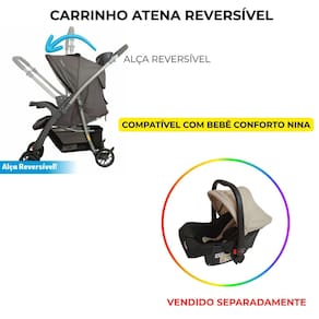Carrinho de bebê atena reversível até 15 kg capota retrátil com porta copo cinza Carrinho atena reversível Desenvolvido para crianças de 0 a 15kg, o carrinho de bebê atena reversível feito em tecido oxford apresenta uma estrutura robusta de aço, garantindo segurança e durabilidade para os pequenos. Seu assento ajustável em 3 posições proporcionando conforto personalizado em qualquer situação. Equipado com cinto de segurança de 5 pontos, os pais podem passear tranquilamente. Além disso, o fechamento deste carrinho é fácil e prático usando apenas uma mão, o que torna o transporte e armazenamento uma tarefa simples e rápida. A capota retrátil oferece proteção contra o sol e outros elementos, enquanto o eixo traseiro e as rodas dianteiras removíveis facilitam ainda mais o transporte e armazenamento do carrinho. O visor na cabeceira do assento permite aos pais manter contato visual com o bebê em todos os momentos, proporcionando tranquilidade. E o tecido acolchoado removível e lavável garante praticidade na limpeza e manutenção do carrinho. Para maior comodidade, o carrinho de bebê atena reversível conta com porta copos duplo para o bebê e na alça para a mamãe, garantindo praticidade durante os passeios. E para fechar com chave de ouro, a alça reversível oferece versatilidade para os pais. O carrinho atena reversível conta com um amplo cesto porta objeto com capacidade de até 5kg e é compatível com o bebê conforto nina. Características: Assento com ajuste em 3 posições Cinto de segurança de 5 pontos Compatível com bebê conforto nina vendido separadamente Sistema de acionamento de freio único nas rodas traseiras Cesto com capacidade de 5kg Porta copos para criança Porta copos na alça Fechamento com uma mão Capota retrátil Eixo traseiro e rodas dianteiras removíveis Tecido de assento acolchoado, removível e lavável. Homologação Inmetro: CE-BRI/IQB 000280 52375/18-107