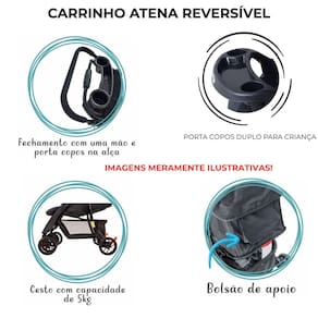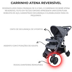 Carrinho de bebê atena reversível até 15 kg capota retrátil com porta copo cinza Carrinho atena reversível Desenvolvido para crianças de 0 a 15kg, o carrinho de bebê atena reversível feito em tecido oxford apresenta uma estrutura robusta de aço, garantindo segurança e durabilidade para os pequenos. Seu assento ajustável em 3 posições proporcionando conforto personalizado em qualquer situação. Equipado com cinto de segurança de 5 pontos, os pais podem passear tranquilamente. Além disso, o fechamento deste carrinho é fácil e prático usando apenas uma mão, o que torna o transporte e armazenamento uma tarefa simples e rápida. A capota retrátil oferece proteção contra o sol e outros elementos, enquanto o eixo traseiro e as rodas dianteiras removíveis facilitam ainda mais o transporte e armazenamento do carrinho. O visor na cabeceira do assento permite aos pais manter contato visual com o bebê em todos os momentos, proporcionando tranquilidade. E o tecido acolchoado removível e lavável garante praticidade na limpeza e manutenção do carrinho. Para maior comodidade, o carrinho de bebê atena reversível conta com porta copos duplo para o bebê e na alça para a mamãe, garantindo praticidade durante os passeios. E para fechar com chave de ouro, a alça reversível oferece versatilidade para os pais. O carrinho atena reversível conta com um amplo cesto porta objeto com capacidade de até 5kg e é compatível com o bebê conforto nina. Características: Assento com ajuste em 3 posições Cinto de segurança de 5 pontos Compatível com bebê conforto nina vendido separadamente Sistema de acionamento de freio único nas rodas traseiras Cesto com capacidade de 5kg Porta copos para criança Porta copos na alça Fechamento com uma mão Capota retrátil Eixo traseiro e rodas dianteiras removíveis Tecido de assento acolchoado, removível e lavável. Homologação Inmetro: CE-BRI/IQB 000280 52375/18-107 Marca: Não Informado