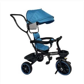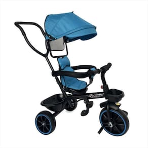 Especificações técnicas: - possui pedal p/pedalar - possui apoio de pés - possui duas cestas: - cesta dianteira aprox. c: 13cm x l: 12cm x a: 6cm - cestatraseira aprox. c: 21cm x l: 35,5cm x a: 12cm - possui guarda-sol com proteção mosquiteiro - possui trava de segurança - possui capa de assento almofadada - possui pneus emborrachado