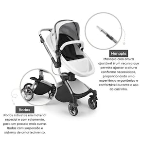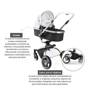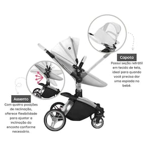 Um carrinho estiloso e de alta qualidade para quem busca praticidade e conforto para os bebês. Seu visual moderno e elegante, resistente e fácil de limpar. Possui interior respirável e macio e confortável. Suas rodas robustas e sistema de amortecimento estão prontos para qualquer terreno. O assento é rotacional, permite diferentes posições para proteção total ao sol e à chuva.