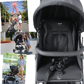 Além disso, o carrinho apresenta fechamento compacto, medindo 78 cm de altura, 55 cm de largura e 45 cm de comprimento quando fechado, facilitando o transporte e o armazenamento.