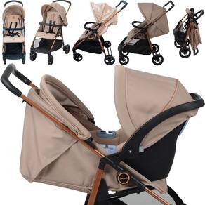 O modelo possui encosto reclinável em quatro posições, capota regulável e removível, cinto de segurança de cinco pontos, protetor frontal removível, rodas dianteiras giratórias, freio traseiro conjugado e cesto porta-objetos.