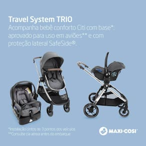 O conjunto Maxi-Cosi Travel System Anna Luxe TS TRIO inclui o bebê conforto Citi e base veicular para instalação com cinto de 3 pontos do veículo. O bebê conforto Maxi-Cosi Citi possui laterais Safe-Side, capota com proteção UV50+ e é aprovado para uso em aviões. *